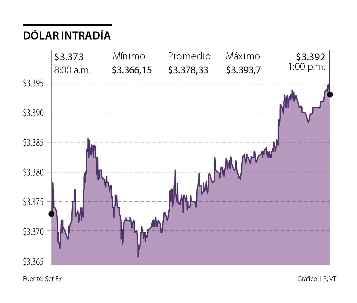 La divisa abrió la jornada con un precio de $3.373 y su cierre fue de $3.392. El precio mínimo que se registró en la plataforma Set-Fx fue de $3.366,15, mientras que el máximo fue $3.393,70. El monto negociado durante la jornada fue de US$1.132,42 millones en 1.595 transacciones.