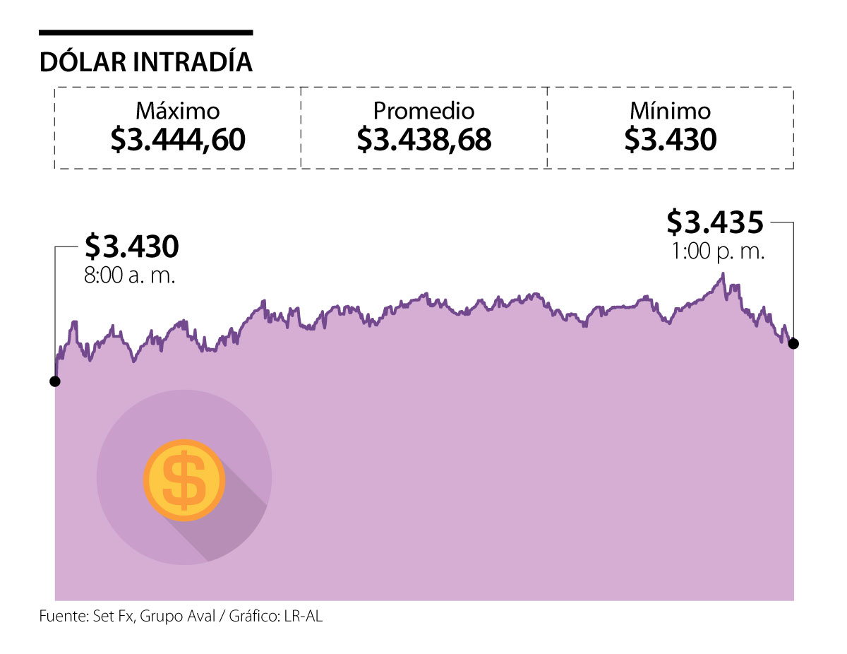 La divisa cotizó en promedio a $3.438,68 en la sesión, lo que representó una leve alza de $0,9 frente a la Tasa Representativa del Mercado, y una diferencia de apenas $0,04 con respecto a su precio promedio de inicio de mes ($3.438,64).