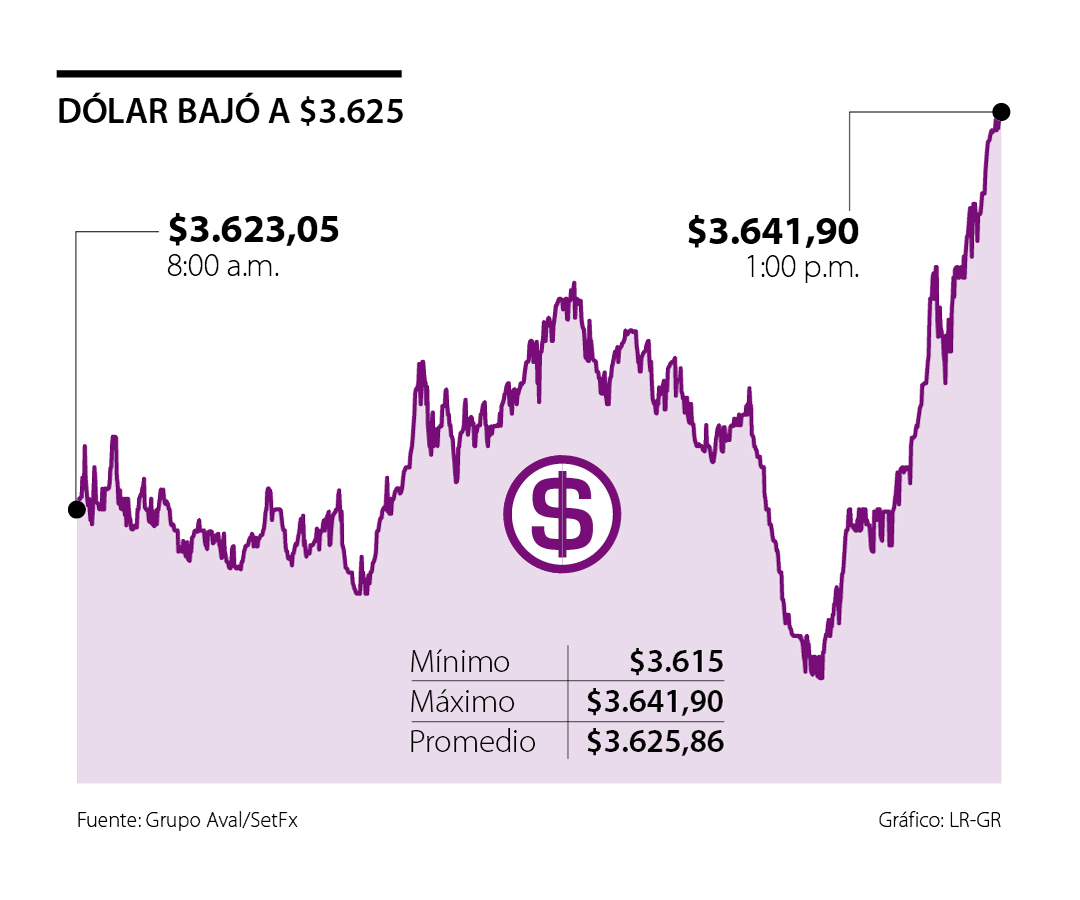 El precio del dólar continúa a la baja, aunque en pequeñas proporciones. En la jornada de ayer, la divisa cayó $5,68 y se negoció en promedio a $3.625,86.
