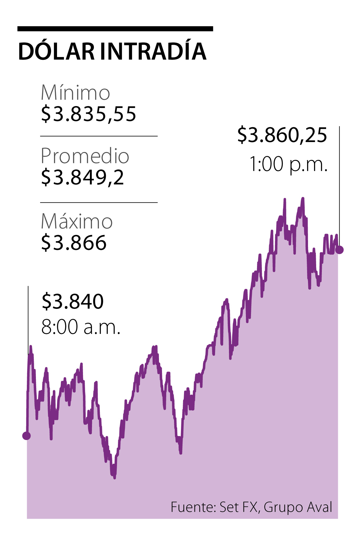 El precio del dólar alcanzó un precio promedio de $3.849,20, lo que representó un alza de $7,74 frente a la Tasa Representativa del Mercado (TRM), que se ubicó en $3.841,46.