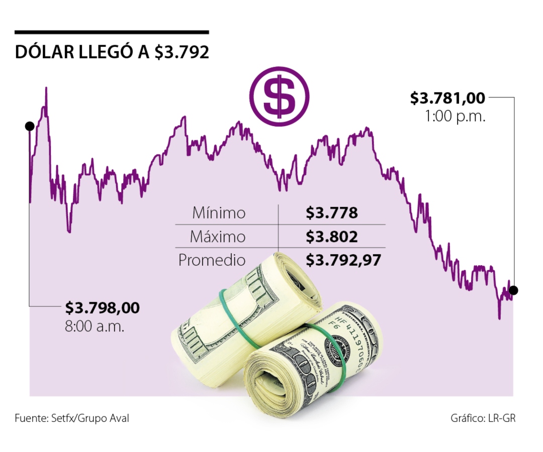 El precio del dólar se acercó a $3.800 y, con un alza intradía de $24,58, se cotizó en promedio a $3.792,97.