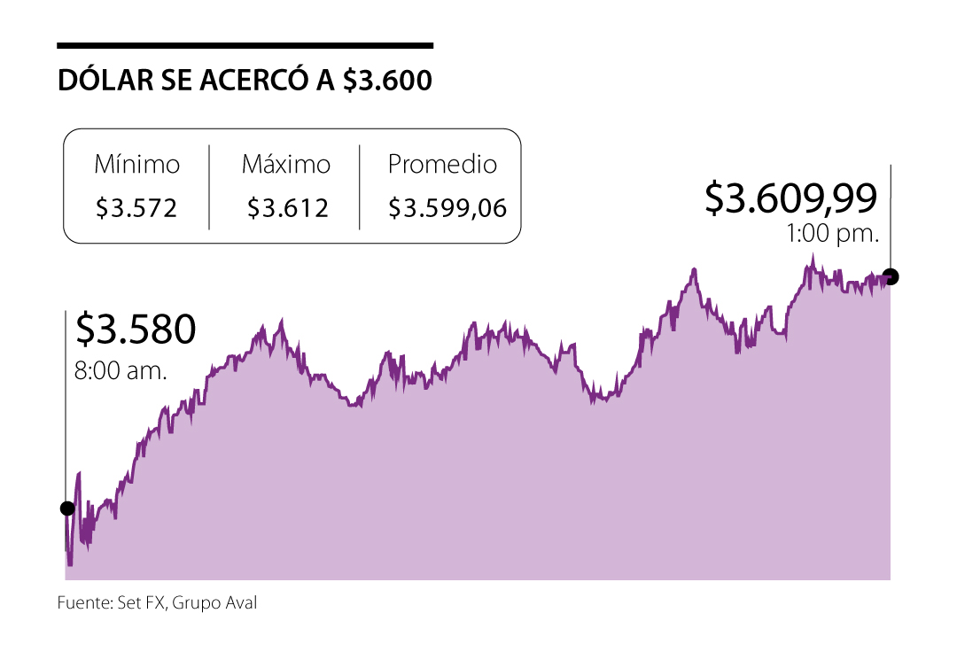 Esta semana inició con un alza intradía de $34 en el precio del dólar, movimiento que lo ubicó en una negociación promedio de $3.599,06. Durante la sesión, la moneda alcanzó un máximo de $3.612.