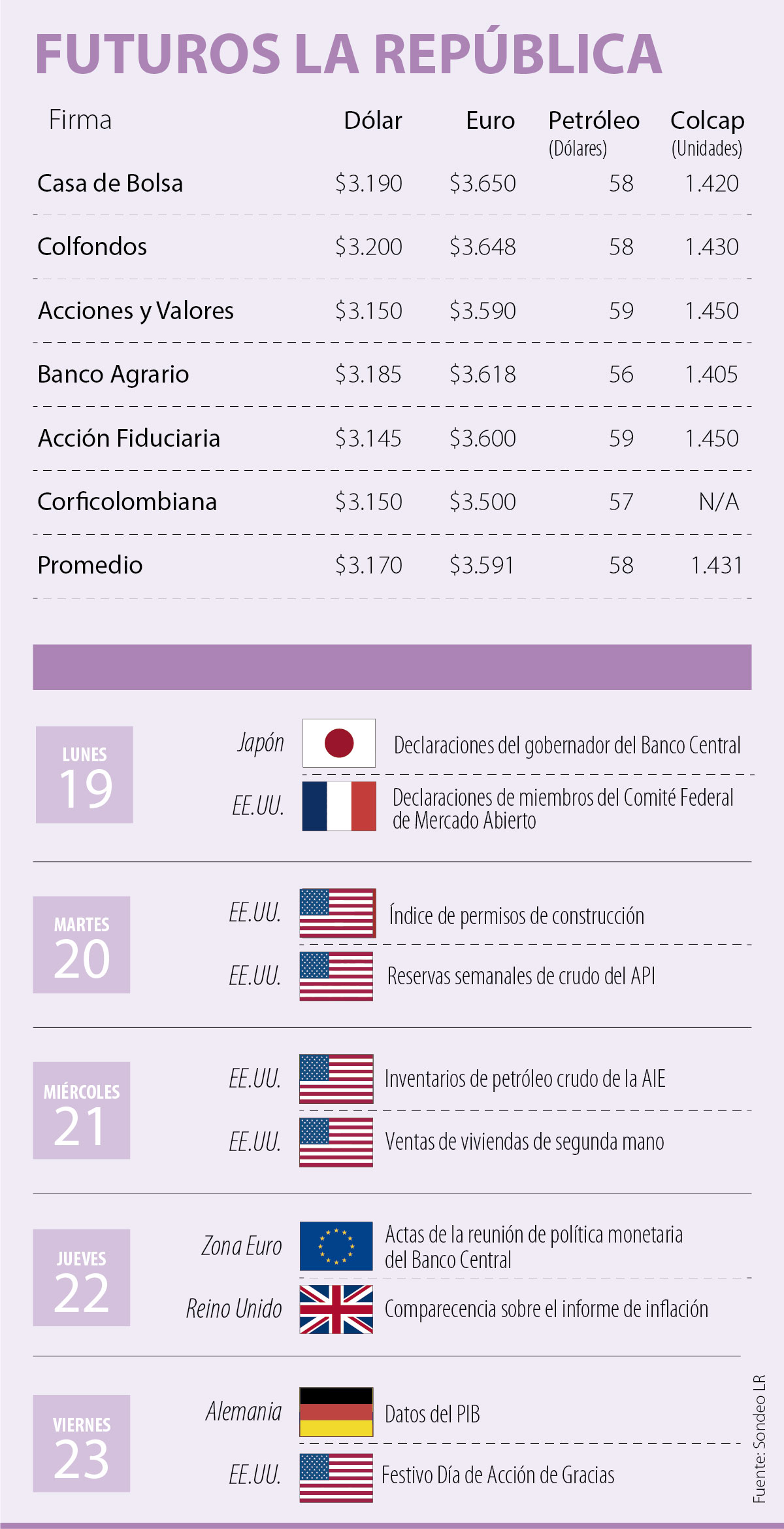 El euro se cotizaría en promedio a $3.595, mientras el crudo WTI continuará en su nivel actual ante mayores expectativas de recortes de la Organización de Países Exportadores de Petróleo (Opep), en un precio de US$59 por barril.