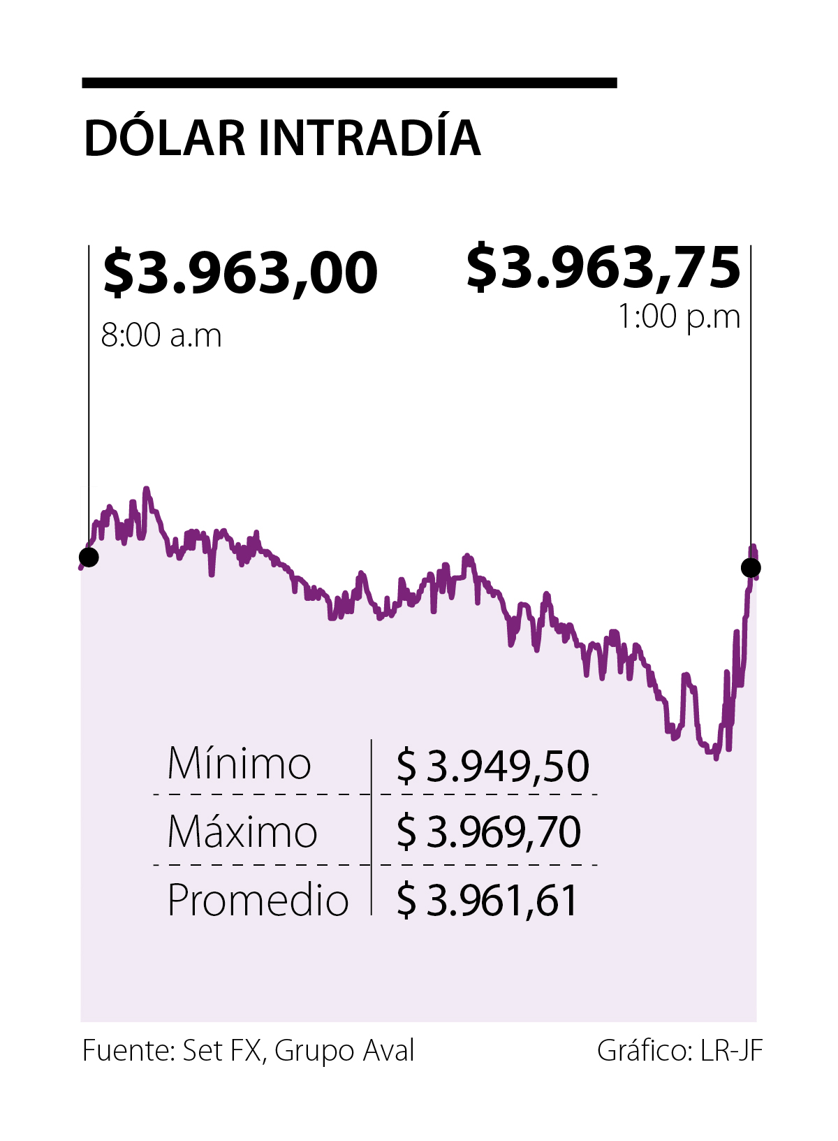 El miércoles, el dólar alcanzó un precio promedio de $3.961,61, lo que representó un aumento de $35,54 frente a la Tasa Representativa del Mercado (TRM), que se ubicó en $3.926,07.