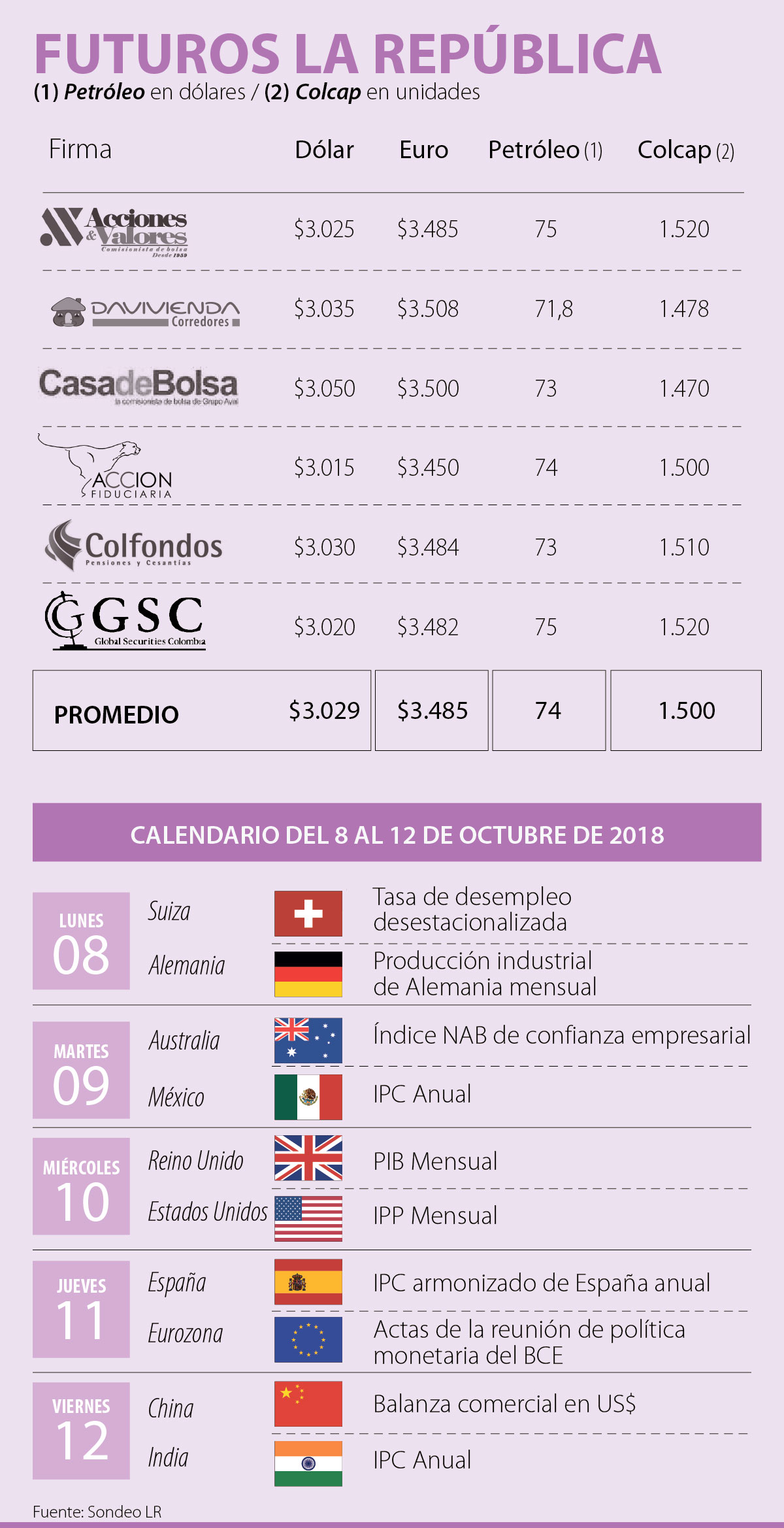 Por su parte el petróleo, después de presentar también unas de las semanas más movidas y llegar a incrementos en su precio que no se veían desde noviembre de 2014, esta semana se proyecta en un precio de US$74 por barril para la referencia WTI según los analistas, lo que significa una disminución respecto al cierre del mercado de la semana pasada, en la que el West Texas Intermediate ganó 1 centavo, cerrando en US$74,34 por barril.