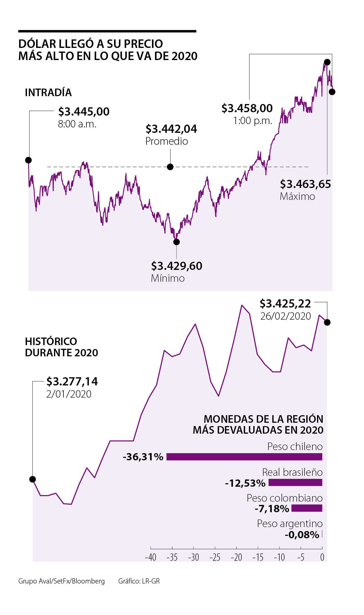 En los primeros 56 días de este año, la divisa estadounidense ganó $164,9, pues comenzó enero en $3.277,14. Además, el peso colombiano es la tercera moneda de Latinoamérica que mayor devaluación ha registrado en este periodo de 2020, con -7,18%; después del real brasileño, con -12,53, y el peso chileno, que es la de mayor golpe, con -36,31%.