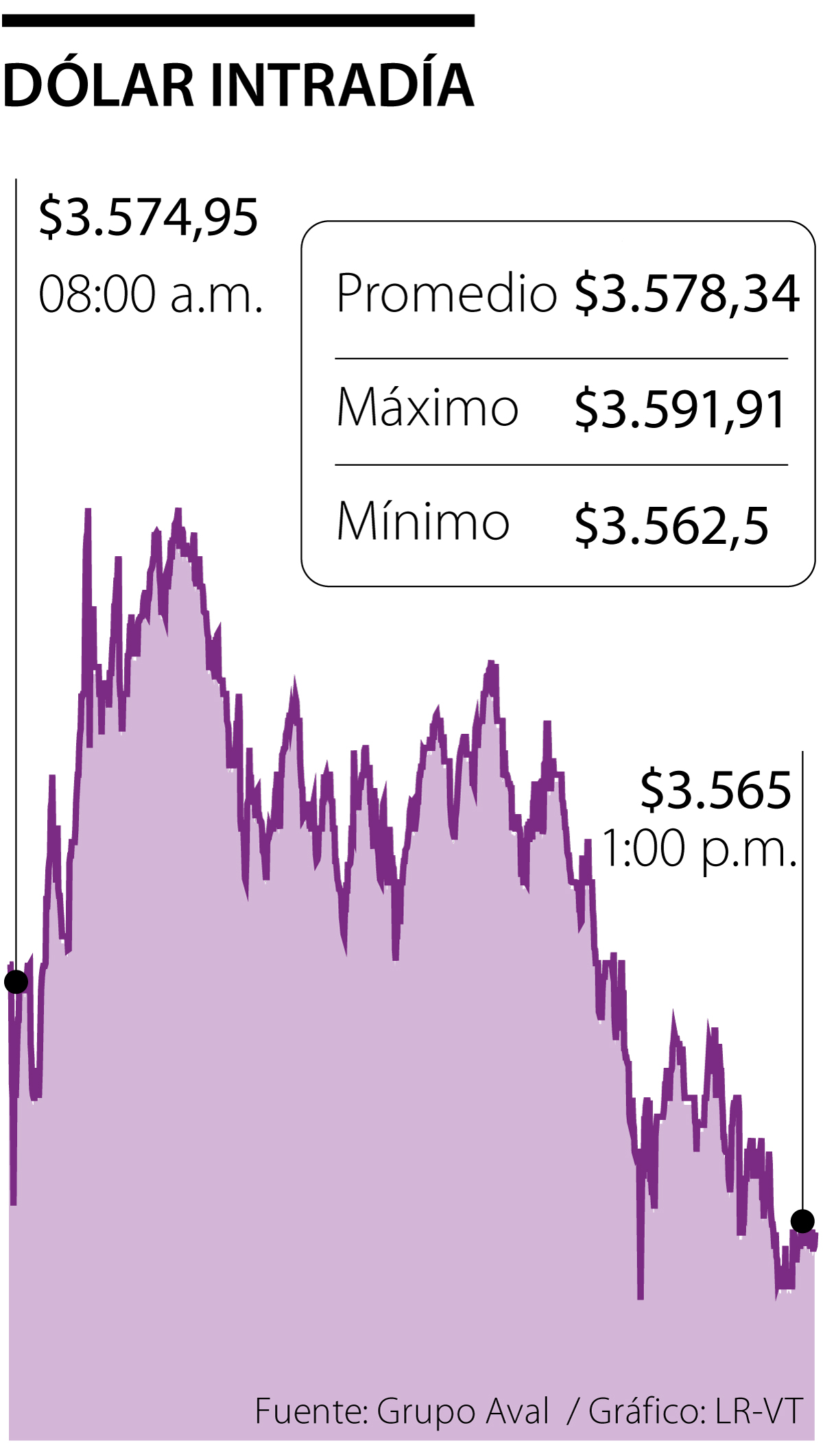 Ayer, el dólar alcanzó un precio promedio de $3.578,33, lo que representó una caída de $12,04 frente a la Tasa Representativa del Mercado (TRM), que para la jornada se ubicó en $3.590,37.