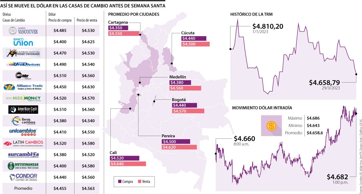 Estos movimientos se dan justamente días antes de que llegue Semana Santa, lo que podría mostrar una ventaja para quienes tengan planeado algún viaje fuera del país y necesiten cambiar pesos por dólares, pues en las casas de cambio la moneda se está vendiendo en promedio a $4.563, unos $95 más barato comparado con la TRM de hoy, que se ubica en $4.658.