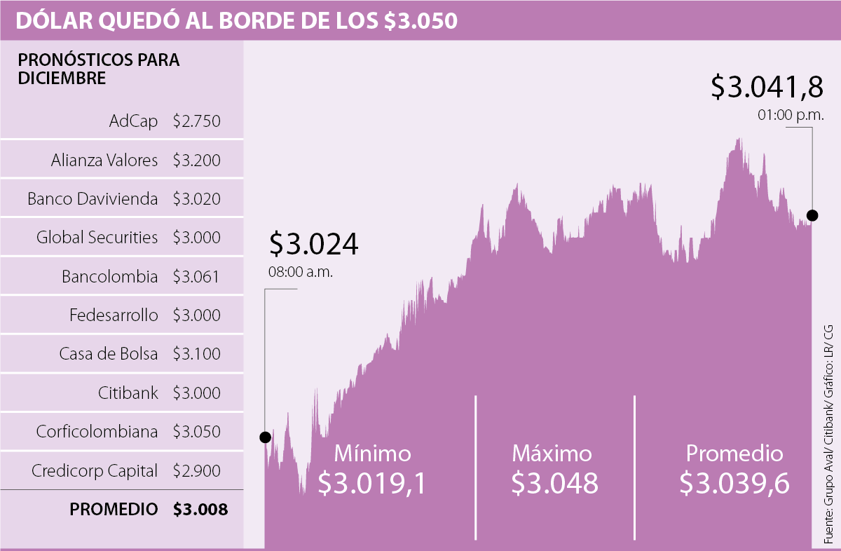 Las encuestas de octubre del Banco de la República y del Citibank apuntaban a que el dólar cerraría el año en $3.000; sin embargo, The Conference Board reveló la cifra de confianza del consumidor en Estados Unidos, la cual se ubicó en 125,9 en octubre, 4,4 puntos por encima del estimado, lo cual llevó a la moneda a su mayor nivel de los últimos 17 años, lo que, en parte, impulsó a la moneda a culminar su mejor mes desde noviembre de 2016, lo que puede llevarlo a estar por encima de este nivel en diciembre.