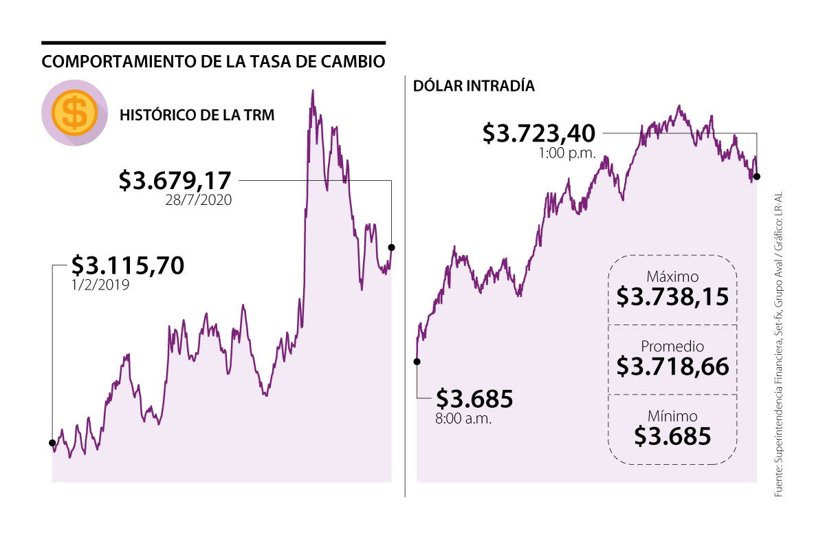 Ayer, el dólar se cotizó en un precio promedio de $3.718,66 y registró un alza de $$39,49 frente a la tasa representativa del mercado (TRM), que se ubicó en $3.679,17. Los analistas consultados por LR señalaron que, en promedio, la divisa norteamericana estará al alza durante esta semana y consideran que se negociará por arriba de los $3.700.