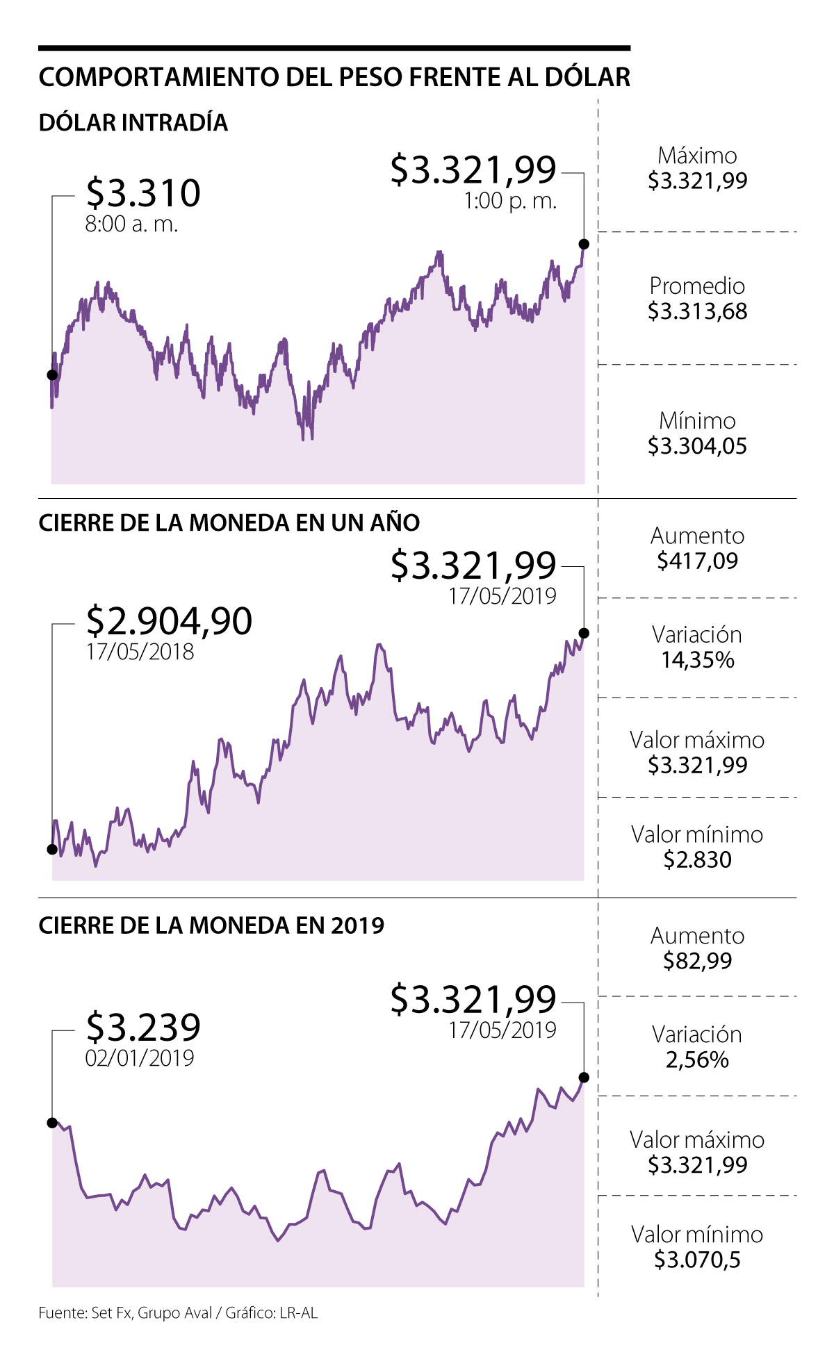 Esta subida ha significado que lo corrido de 2019 el dólar ha visto un alza de $82,99 en su valor, la cual podría ser mayor, de no ser porque en los primeros meses estuvo por debajo de $3.100. Si se calcula su movimiento en un año se encuentra que entre el 17 de mayo de 2018 y la misma fecha de 2019 su encarecimiento fue de $417,09.