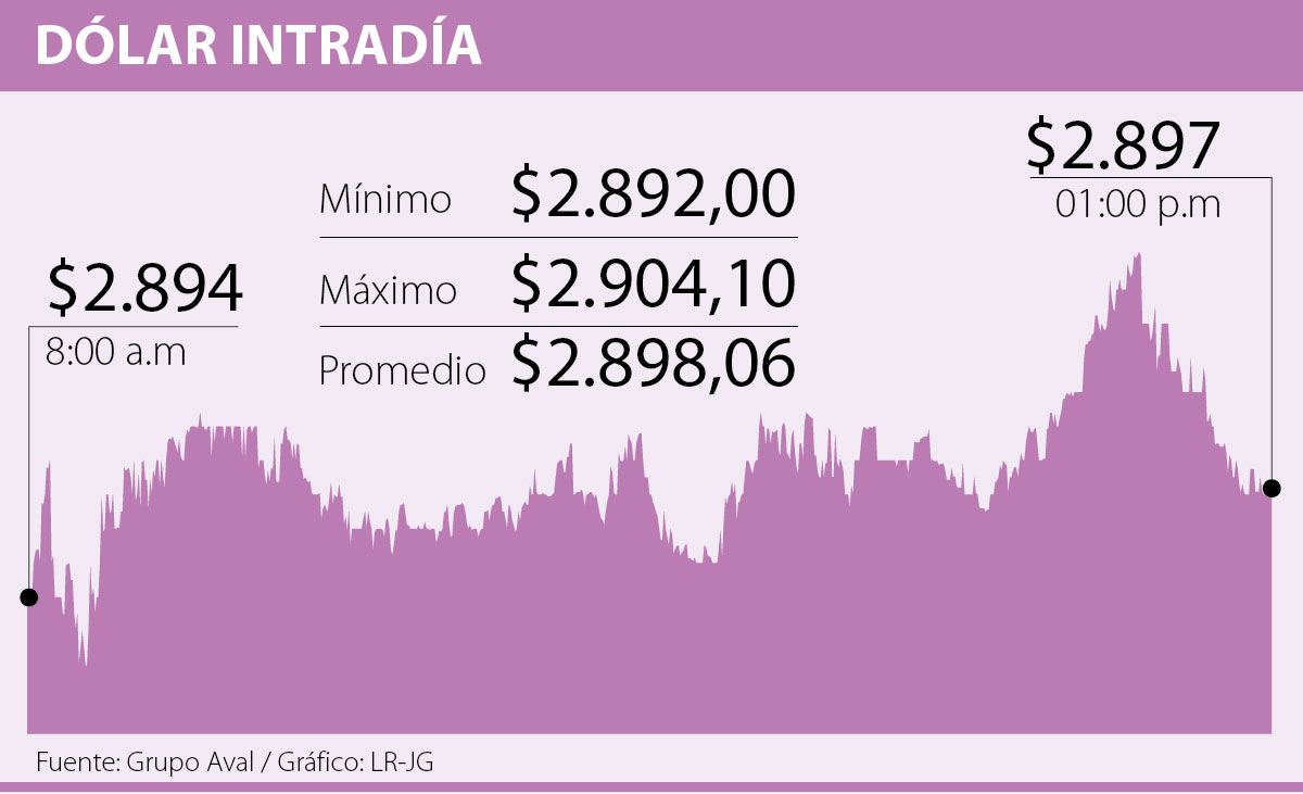 La apertura de la moneda estuvo en $2.894 y su cierre fue de $2.897, periodo en el cual se realizaron 1.053 transacciones, con las cuales se negociaron más de US$715,4 millones.