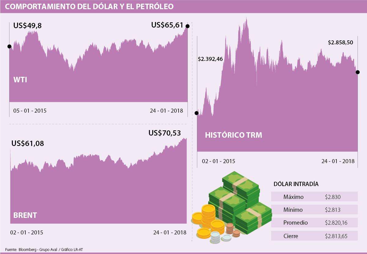 Aunque son varias las razones que tienen al dólar en mínimos, la tendencia está relacionada principalmente con los niveles que está marcando el petróleo de referencia Brent, que esta semana llegó a tocar los US$70,53 por barril (cierre de la jornada de ayer), gracias al avance de los acuerdos de reducción en la producción de la Organización de Países Exportadores de Petróleo (Opep), los acuerdos entre Rusia y Arabia Saudí y la caída de las reservas internacionales.