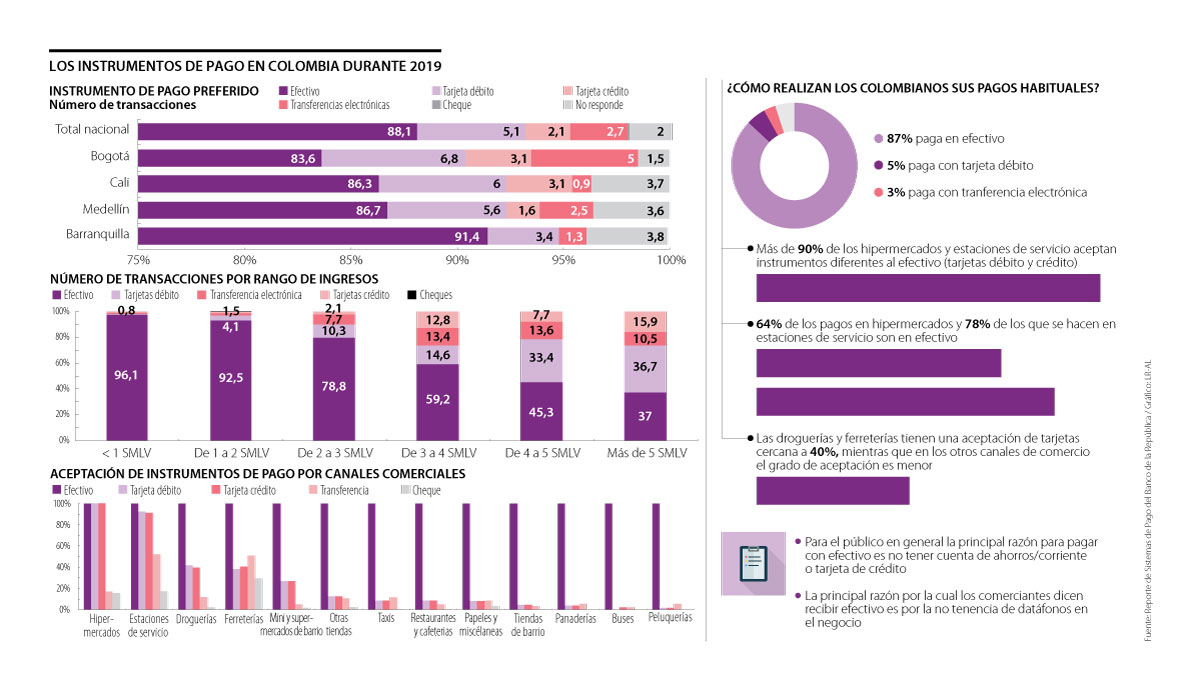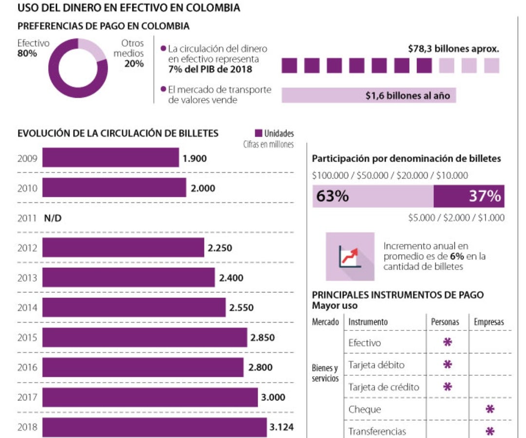 De acuerdo con la Encuesta nacional sobre provisión de los billetes y monedas e instrumentos de pago (Epbmip), que es realizada dos veces al año por la Subgerencia Industrial del Banco de la República, 88,1% de las transacciones que se hicieron en 2019 fueron con efectivo. Sin embargo, si se compara con los resultados de la encuesta de 2017, este medio de pago tuvo una disminución en su importancia, ya que hace tres años su participación fue de 92,4%.