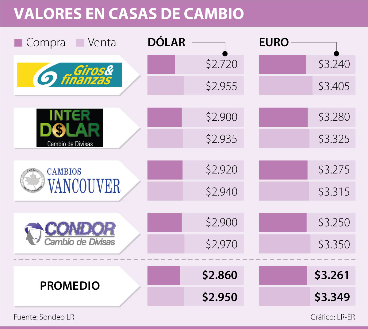 Por el contrario, si lo que se quiere es ofrecer los euros que sobraron de su último viaje, el promedio entre los minoristas está en $3.261, y en el lugar en el que podría ganar más es en InterDólar, pues allí le compran un euro por $3.280, seguido de Cambios Vancouver, donde ofrecen $3.275.