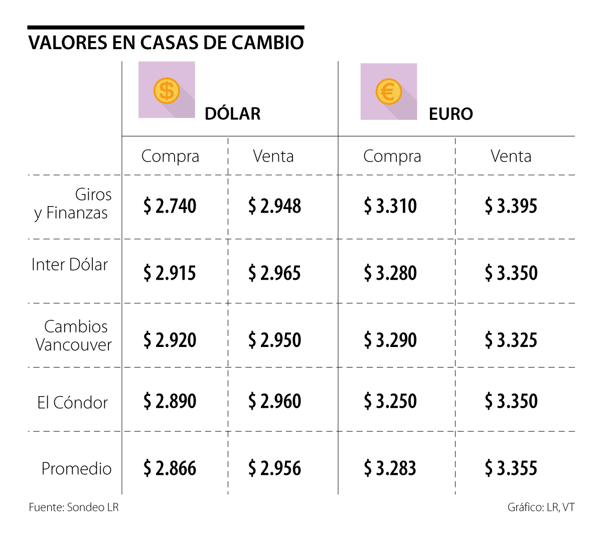 Sin embargo, si su caso es que cuenta con esta divisa y quiere venderla, el lugar más rentable es Giros Y Finanzas, pues allí le compran un euro a $3.310. La segunda casa de cambio con mejor oferta es Cambios Vancouver a $3.290, seguido de Inter Dólar a $3.280 y El Cóndor a $3.250.