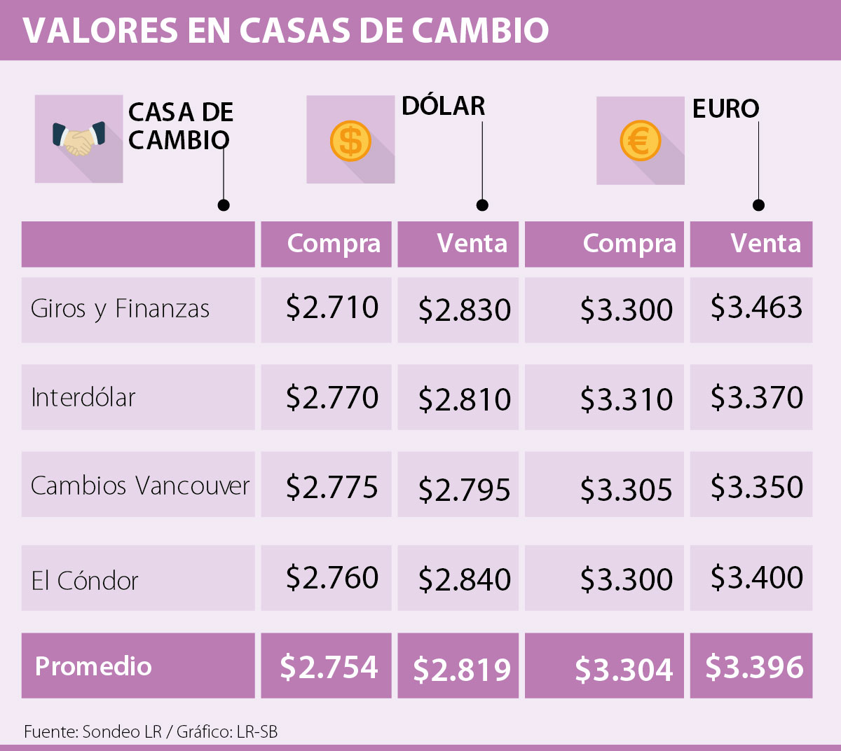 Ahora, si usted en lugar de visitar Europa, irá a EE.UU. o zonas en las que se utilice el dólar americano y necesita comprar esta moneda, la opción más rentable es Cambios Vancouver al venderle la divisa a $2.795, seguido de Interdólar, Giros y Finanzas y El Cóndor con $2.810,$2.830 y $2.840; respectivamente.