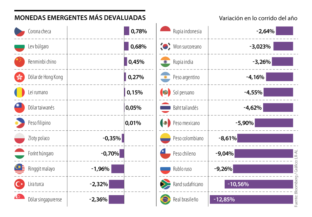 El peso chileno fue la cuarta moneda más devaluada, con una pérdida de 9,04%. El peso colombiano, por su parte, fue la quinta moneda emergente que más valor perdió, con un negativo de 8,62%.