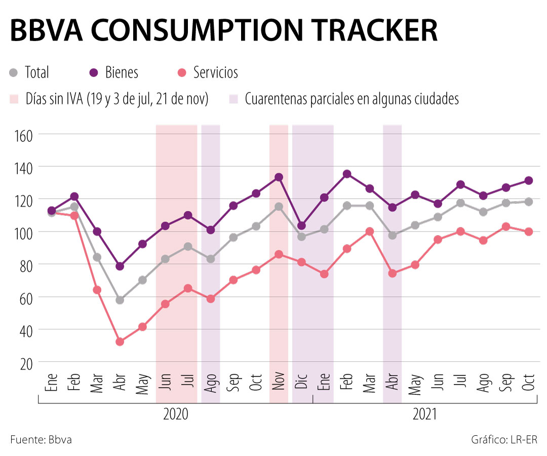 El Consumption Tracker es un indicador de consumo que construye Bbva haciendo uso de las transacciones realizadas por sus clientes con tarjetas débito y crédito y desagregándolas según el sector económico al que pertenecen. Los datos de la última edición tienen cierre al 25 de octubre de 2021.