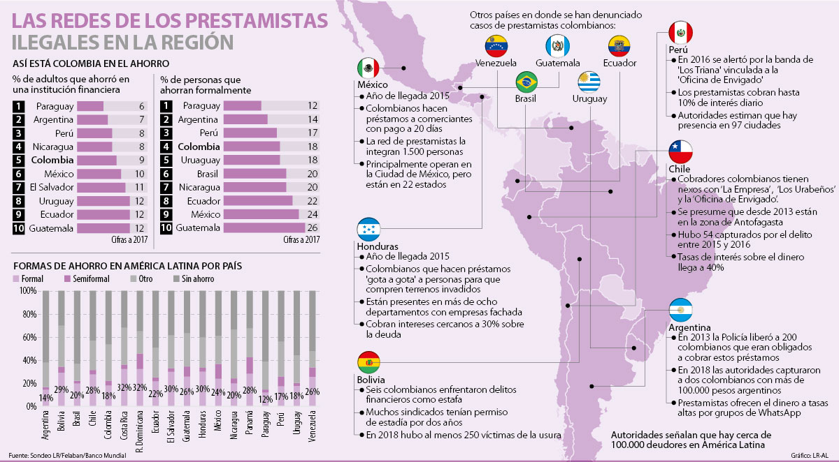 Para los expertos, la economía informal y la falta de educación financiera, que son comunes denominadores en América Latina, han sido factores clave para que los prestamistas puedan montar sus estructuras delictivas. Sin embargo, a estas características también se les suma la falta de ahorro y de incentivos que hay para tal práctica. Según Felaban, la mayoría de los latinoamericanos no tenían ninguna forma para guardar su dinero, y en pocos países la vía formal de ahorro superaba 30% de la población (ver gráfico).