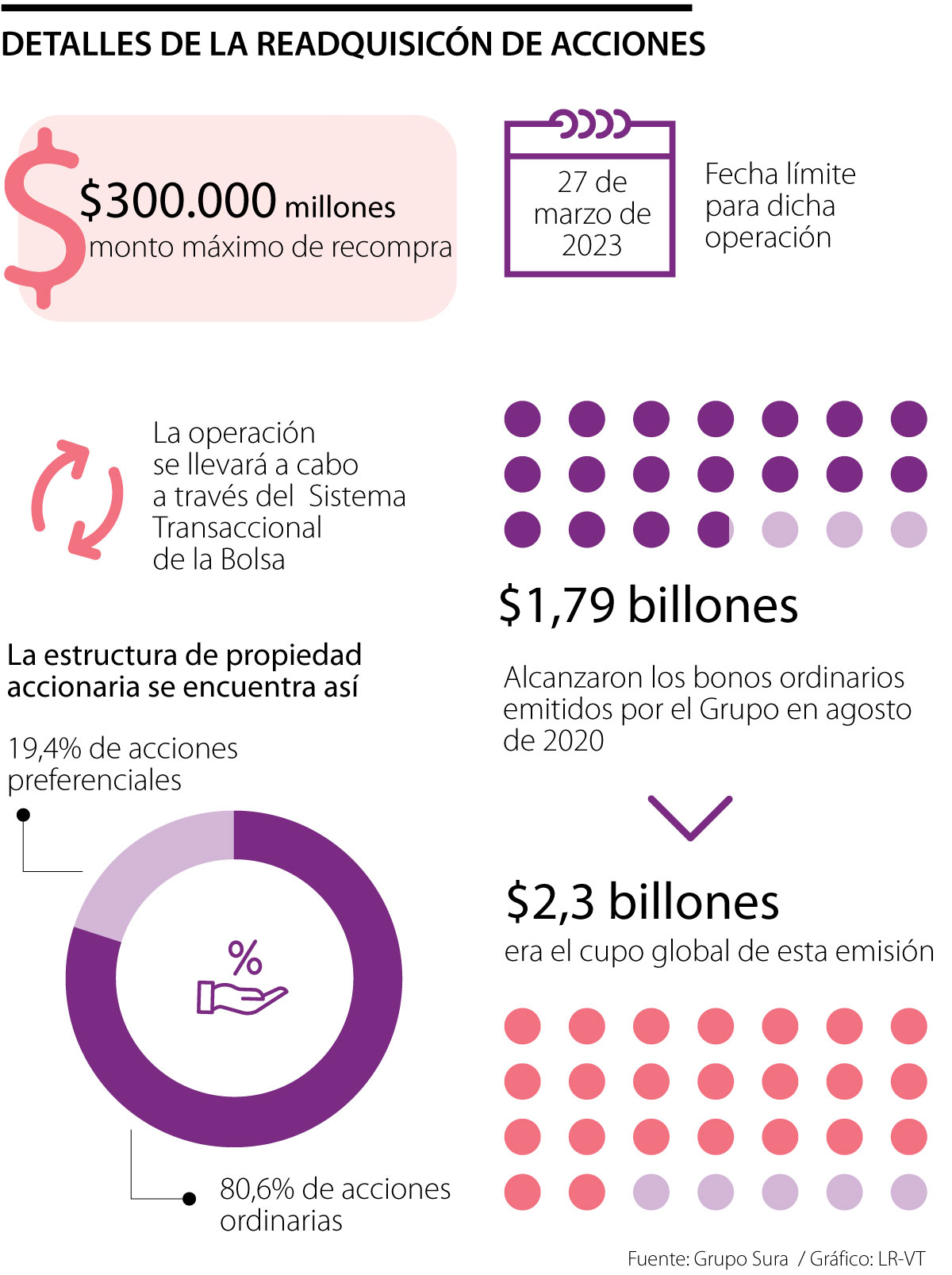 Grupo Sura anunció el inicio del proceso de readquisición de acciones ordinarias y preferenciales de la compañía, que fue autorizado el pasado 27 de marzo de 2020 por la Asamblea Genera del Accionistas y que recibió el visto bueno de la Bolsa de Valores de Colombia (BVC) en abril de este año.