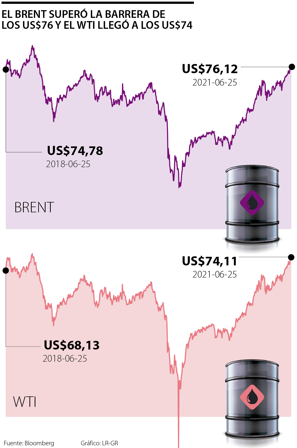 El petróleo finalizó su quinta semana consecutiva al alza. Ayer, el barril Brent llegó a US$76,12, precio que no se registraba desde el 30 de octubre de 2018, y el West Texas Intermediate (WTI) alcanzó US$74,11, barrera que no superaba desde el 9 de octubre de ese mismo año.