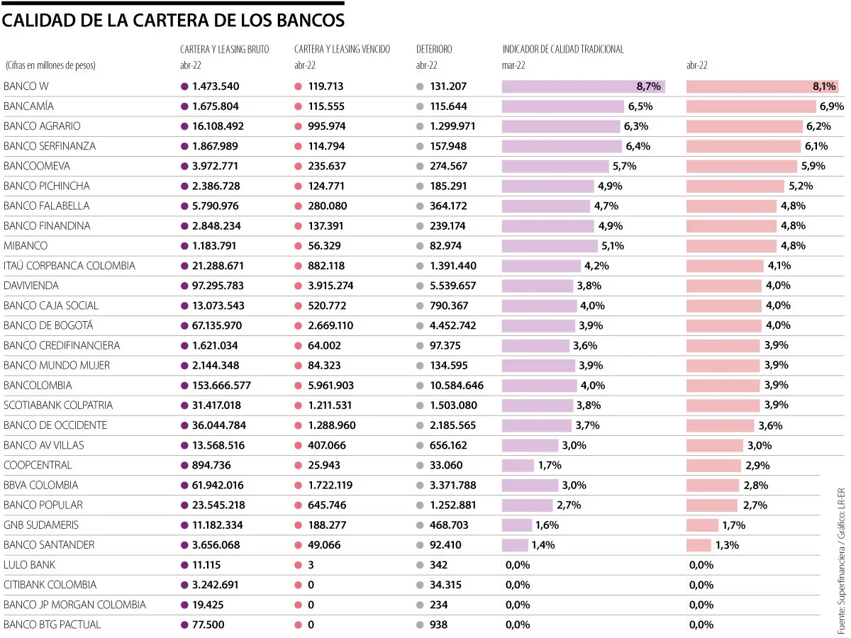 Si se hace la desagregación por entidades, el ente de control reveló que los bancos con los mayores índices de cartera vencida al cuarto mes del año fueron Banco W (8,1%), Bancamía (6,9%), Banco Agrario (6,2%), Serfinanza (6,1%) y Bancoomeva (5,9%).
