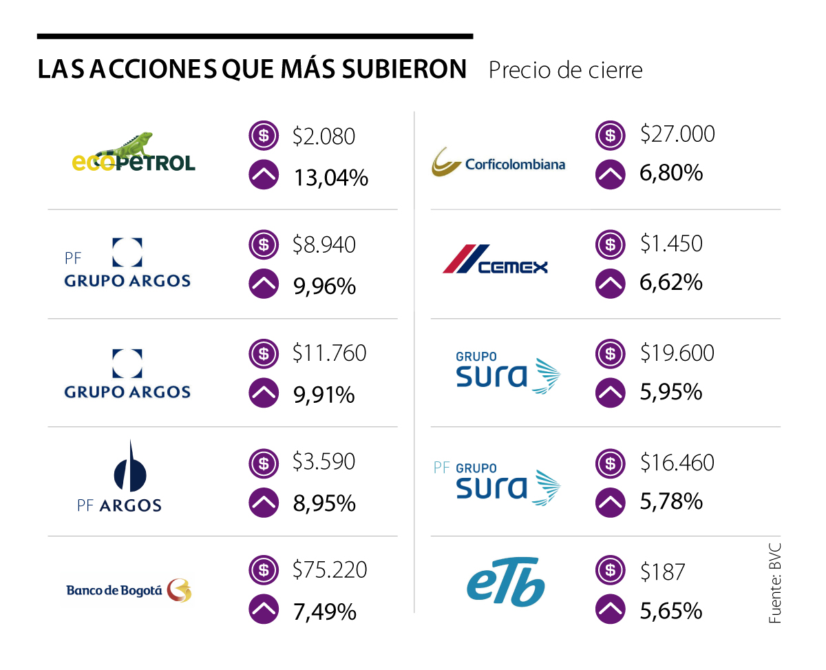 El buen momento del sector petrolero también tuvo un impacto en la especie de Ecopetrol, que fue la que más subió durante la sesión. La acción de la petrolera aumentó 13,04% y cerró en $2.080. Su precio de cierre el miércoles fue de $1.840.