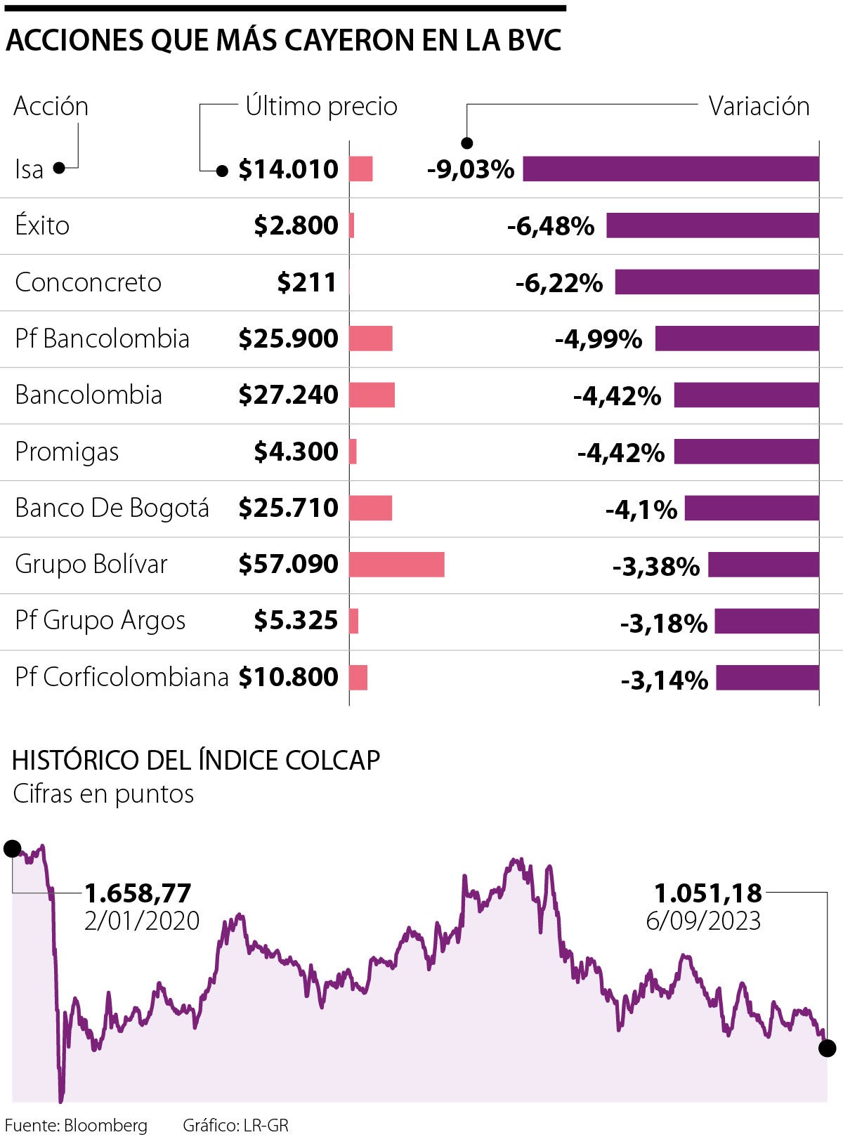 Otras acciones que se desvalorizaron fueron los títulos preferencial y ordinaria de Bancolombia que cayeron 4,99% y 4,42%, respectivamente. También bajó la acción de Promigas (-4,42%), Banco de Bogotá (-4,10%), Grupo Bolívar (3,38%) y PF Grupo Argos (-3,18%).