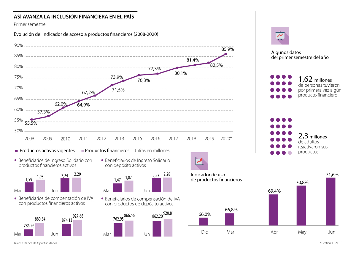 En el reporte de ‘Inclusión Financiera’, que fue elaborado por Banca de las Oportunidades y el Departamento Nacional de Planeación (DNP), se resaltó que 1,6 millones de adultos tuvieron por primera vez algún producto financiero y 2,3 millones de adultos reactivaron sus productos, con respecto a lo observado al cierre de 2019.