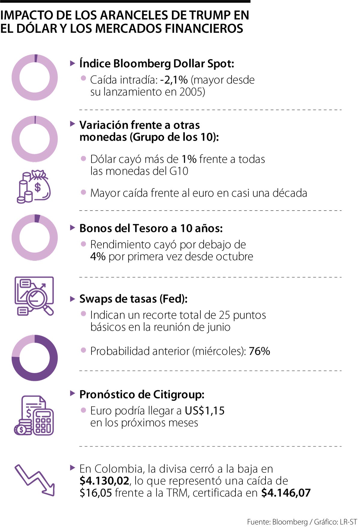 “Esto alejará a los inversores de Estados Unidos y provocará una depreciación del dólar”. La debilidad del dólar se produce en un momento en que los operadores luchan por evaluar cómo las medidas, que fueron más duras y de mayor alcance de lo que muchos esperaban, afectarán el crecimiento y la inflación de Estados Unidos en los próximos meses. Por ahora, muchos consideran que una desaceleración de la economía estadounidense es una amenaza mayor que un repunte de la inflación.