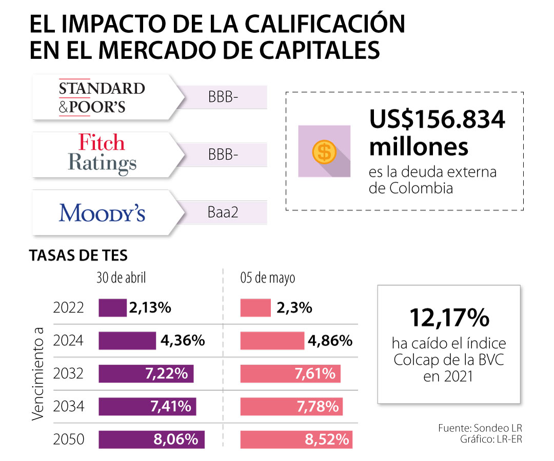 Tras el retiro del proyecto de la reforma tributaria que presentó el Gobierno y a la espera de un consenso sobre uno nuevo que equilibre las finanzas públicas, se prevé una posible degradación de la calificación crediticia de Colombia por parte de las firmas especializadas, como Standard & Poor’s, Fitch Ratings y Moody’s.