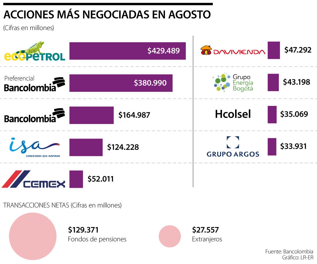 En agosto, Ecopetrol lideró el ranking de las acciones más negociadas en la Bolsa de Valores de Colombia (BVC), con un volumen de $429.489 millones, seguida por preferencial Bancolombia ($380.990 millones), Bancolombia ($164.987 millones), e ISA ($124.228 millones).