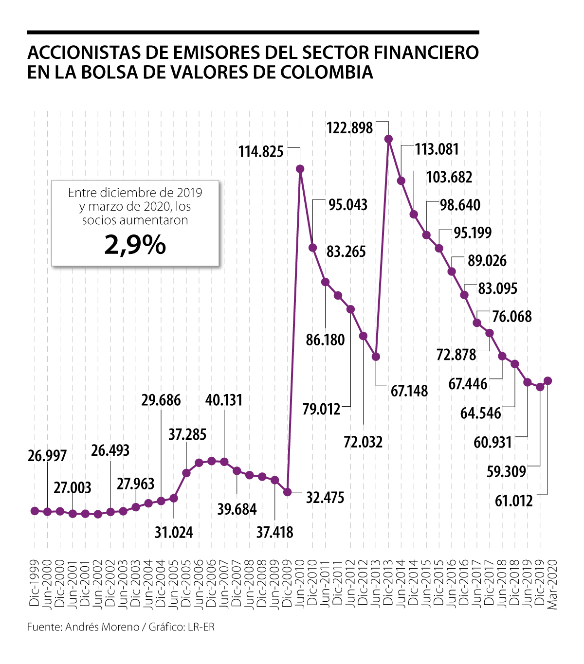 Las personas naturales que poseen especies emitidas por empresas del sector financiero aumentaron 2,9% en los tres primeros meses de 2020, es decir, que entre diciembre y marzo sumaron 1.703 nuevos accionistas y cerraron el primer trimestre con 61.012 socios. En el caso de este segmento, su salida constante de la BVC se remonta a 2014, después de la emisión de acciones preferenciales de Bancolombia.