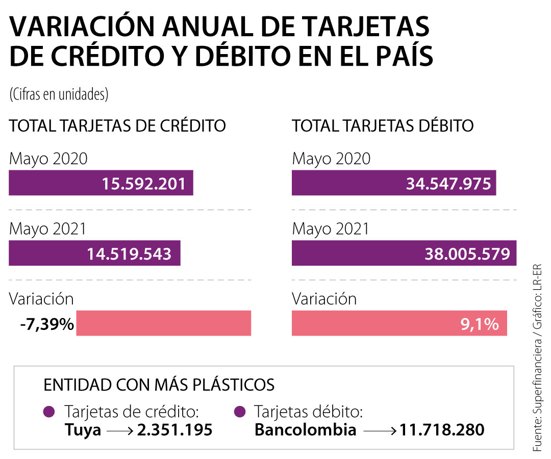 Por entidad, los establecimientos de crédito que más participación tienen en este mercado son Tuya, con 2,3 millones de plásticos; Scotiabank Colpatria, con 2,1 millones; y Bancolombia, con 2 millones.