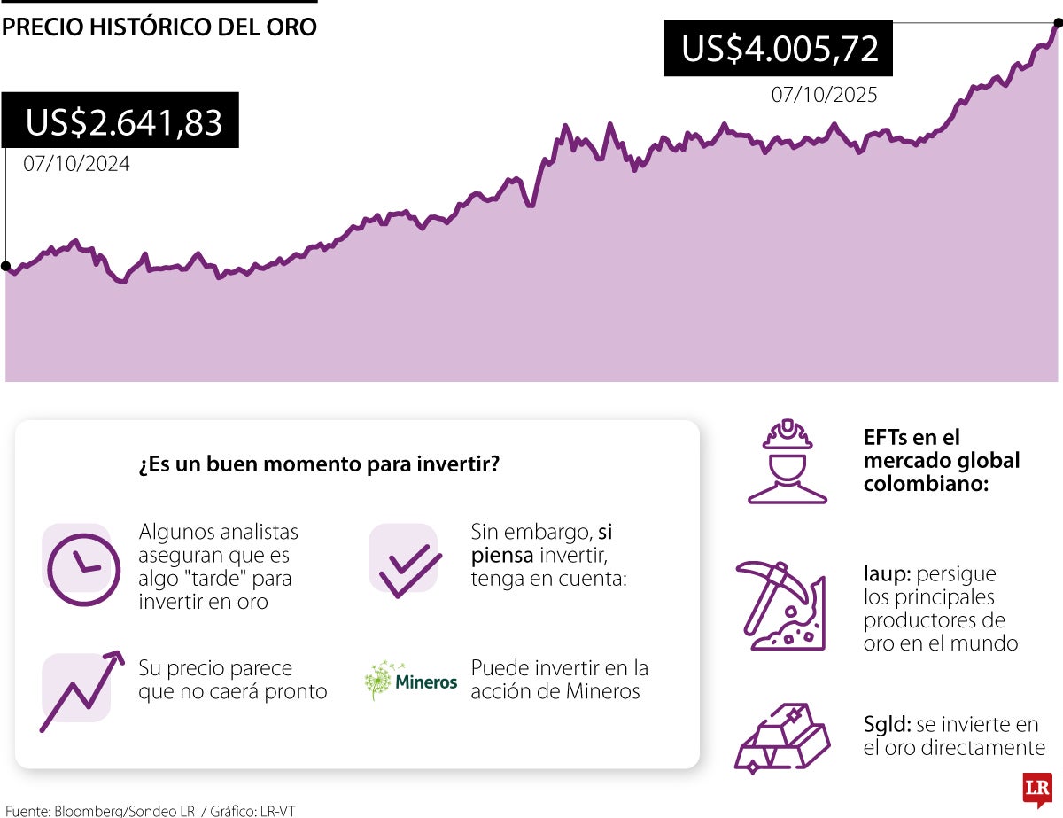 El precio del oro rompió la barrera de los US$4.000 por onza. El activo vuelve a ser el refugio de los inversionistas por las tensiones en Estados Unidos con el cierre de gobierno y la crisis política de Francia. Aunque algunos expertos aseguran que es un poco tarde para invertir por el repunte de su precio, otros aseguran que es viable comprar acciones de Mineros o invertir en dos ETFs del mercado global colombiano.