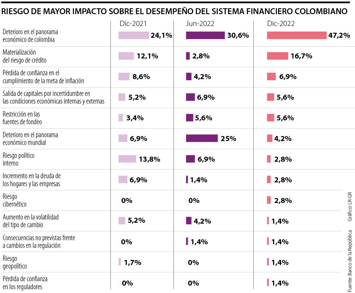 La estabilidad del sistema financiero se encuentra en puntos de calma, sin embargo, según el reporte del Banco de la República, las entidades encuestadas manifestaron que el deterioro de la cartera de créditos y el incremento en el nivel de precios fueron las mayores preocupaciones. Esto, según Ana Vera Nieto, economista jefe de In On Capital, debido a que, “con la actividad económica desacelerándose y también con las mayores tasas es más riesgoso porque muchas personas o empresas presentan dificultades para pagar sus obligaciones financieras”.