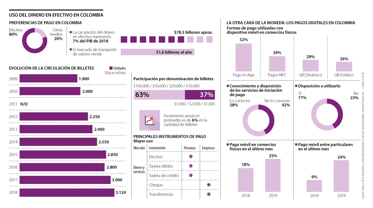 Sin embargo, el director ejecutivo de Fedeseguridad, gremio que agrupa a las cinco compañías de transporte de valores más grandes del país, Nicolás Botero, aseguró que, por el contrario, el método que genera mayor seguridad a la hora de efectuar un pago es el dinero en efectivo, porque el usuario presencia la transacción y señaló que el dinero físico será uno de los principales mecanismos para la reactivación de la economía.