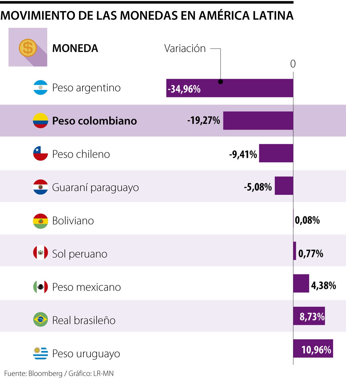 Para el caso de la primera, esta completa una variación negativa de 34,9%, según datos de Bloomberg. A esta le siguen la moneda local, con un retroceso de 19,2%; el peso chileno, con una caída de 9,41%; y el guaraní paraguayo, con un descenso de 5,08%. En el lado contrario destaca el peso uruguayo, que ya se ha valorizado 10,96% este año. Así mismo, el real brasileño asciende 8,73%, el peso mexicano 4,38% y el sol peruano 0,77%.