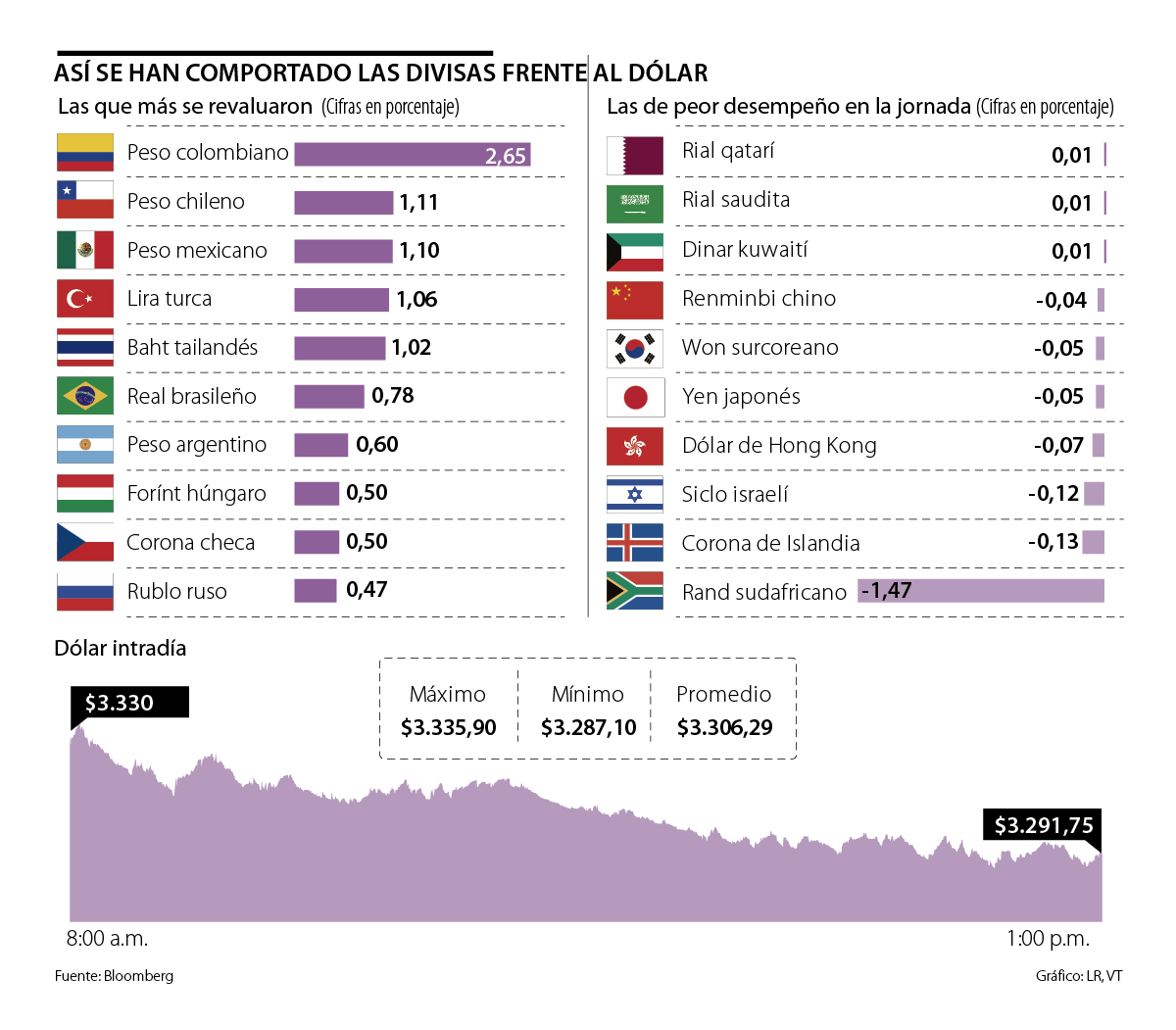Con respecto al primero, en la mañana de ayer, Jose Luis Hernández, trader de mesa institucional de Corficolombiana, explicó que el peso colombiano comenzó la semana con “buenas sensaciones”, luego de que se confirmara la pausa del programa de compras de reservas vía opciones Put, con lo que la moneda local, con respecto al dólar, llegaría nuevamente a niveles de $3.300.