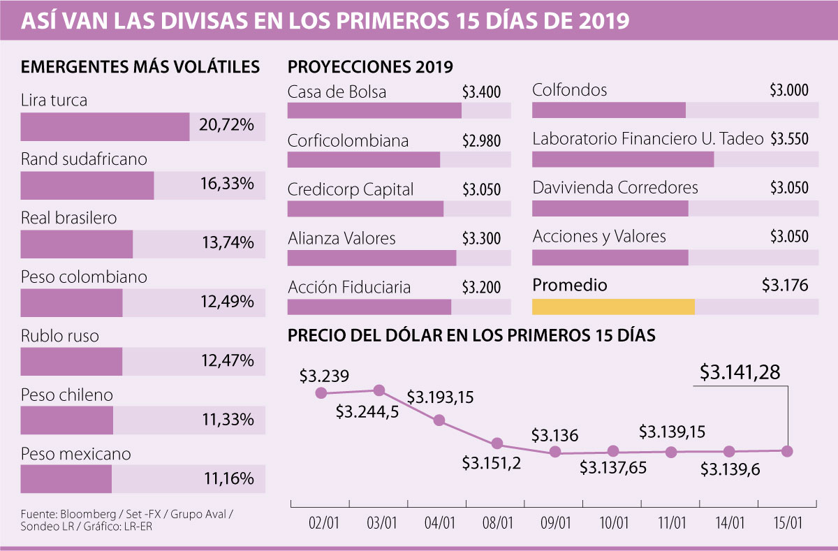El peso colombiano se mantuvo entre las monedas emergentes más volátiles transcurridos los primeros quince días del año. Hasta el cierre de ayer, la divisa contó con una volatilidad explícita de 12,49%, y fue superada únicamente por la lira turca (20,7%), el rand sudafricano (16,3%) y el real brasilero (13,7%).