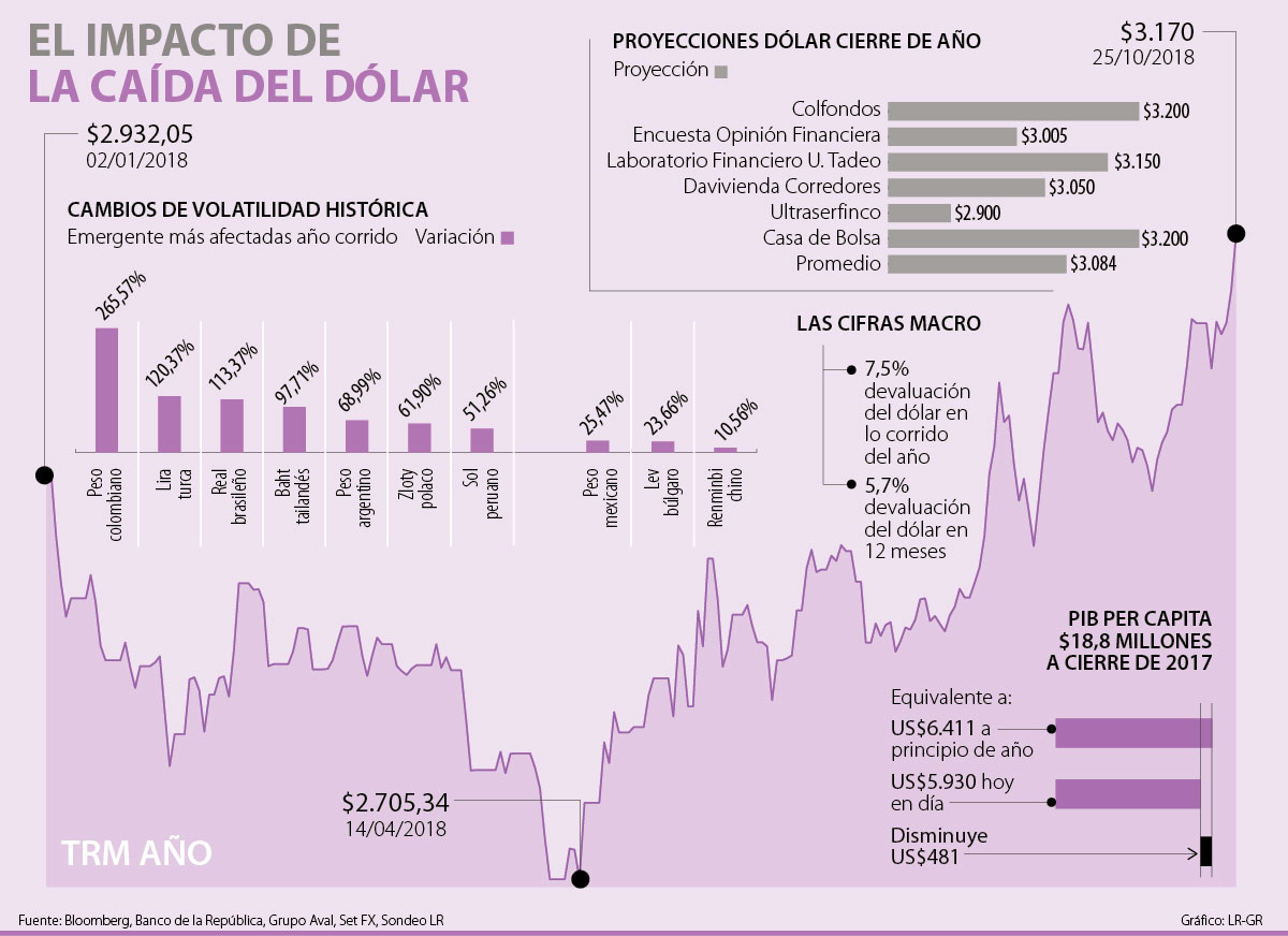 Según el índice de Bloomberg, que mide los cambios de volatilidad histórica, el peso colombiano ha visto una variación de 265,57% en 2018. Una cifra que dobla la alcanzada por la lira turca, la que le sigue en la tabla con un total de 120,37% en el año.