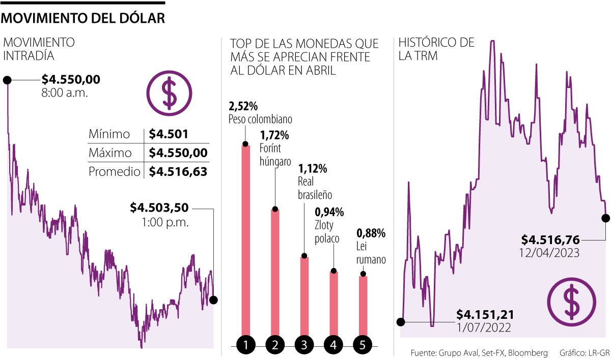 Durante la jornada del martes, la divisa tocó máximos de $4.550 y mínimos de $4.501, una cifra que llamó la atención de los inversionistas, pues es una tendencia que le permite al peso colombiano ser la moneda emergente con mayor fortaleza durante abril.