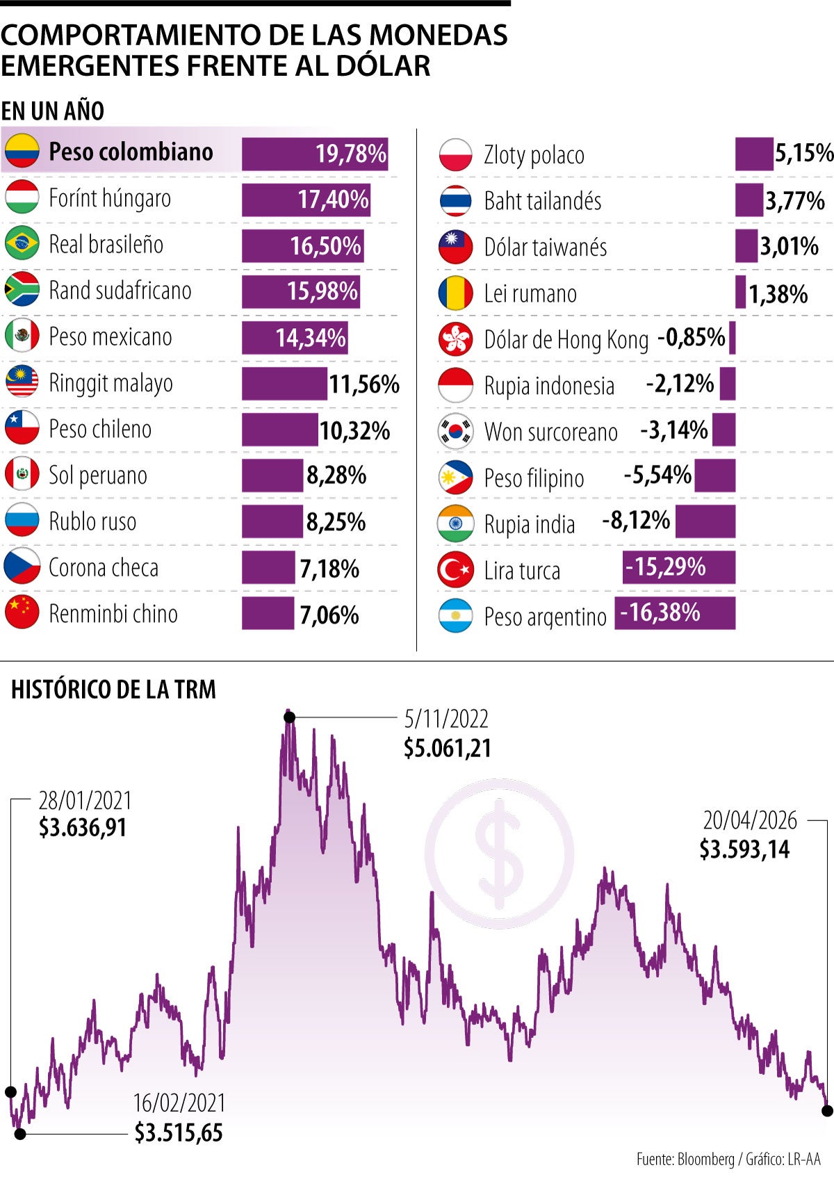 De hecho, solo ayer, el peso colombiano cayó hasta $3.593 un dato no visto desde 2021 y se posiciona como la moneda emergente con mejor desempeño frente al dólar en el último año, al registrar una apreciación de 19,78%. Este resultado lo ubica por encima de otras divisas relevantes como el forínt húngaro (17,40%) y el real brasileño (16,50%), en un contexto en el que varias economías emergentes han logrado fortalecerse frente a la moneda estadounidense.