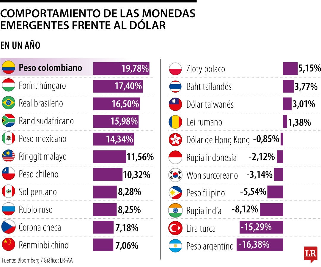 También destacan el rand sudafricano (15,98%) y el peso mexicano (14,34%), lo que evidencia una tendencia general de recuperación en mercados emergentes, aunque con un liderazgo claro por parte de Colombia. Más atrás en el listado aparecen monedas como el ringgit malayo (11,56%), el peso chileno (10,32%) y el sol peruano (8,28%), mientras que otras divisas como el renminbi chino (7,06%) y el zloty polaco (5,15%) presentan avances más moderados. En la parte baja se ubican el baht tailandés (3,77%), el dólar taiwanés (3,01%) y el lei rumano (1,38%), reflejando una apreciación más limitada.