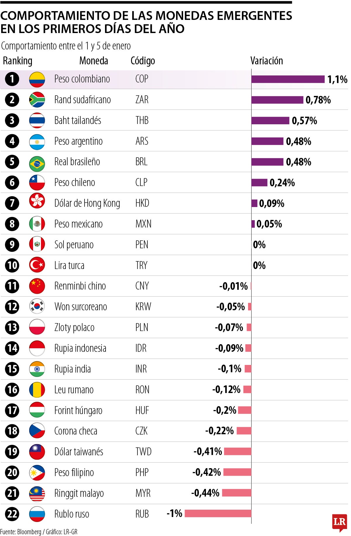 En el listado de las más valorizadas en los primeros días del año, el rand sudafricano y el baht tailandés están en segundo y tercer lugar, con valorizaciones de 0,78% y 0,57%, respectivamente. En el ranking también está el peso argentino y el real brasilero, con 0,48% de alza cada uno. También se encuentran el peso chileno (0,24%); dólar de Hong Kong (0,09%); y peso mexicano (0,05%).