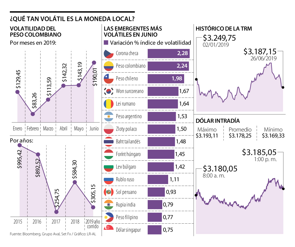 En lo corrido del año, la volatilidad del peso ya muestra un indicador de $305,15 frente al dólar, mientras que el año anterior alcanzó $584,30 y en el 2017, unos $254,75.
