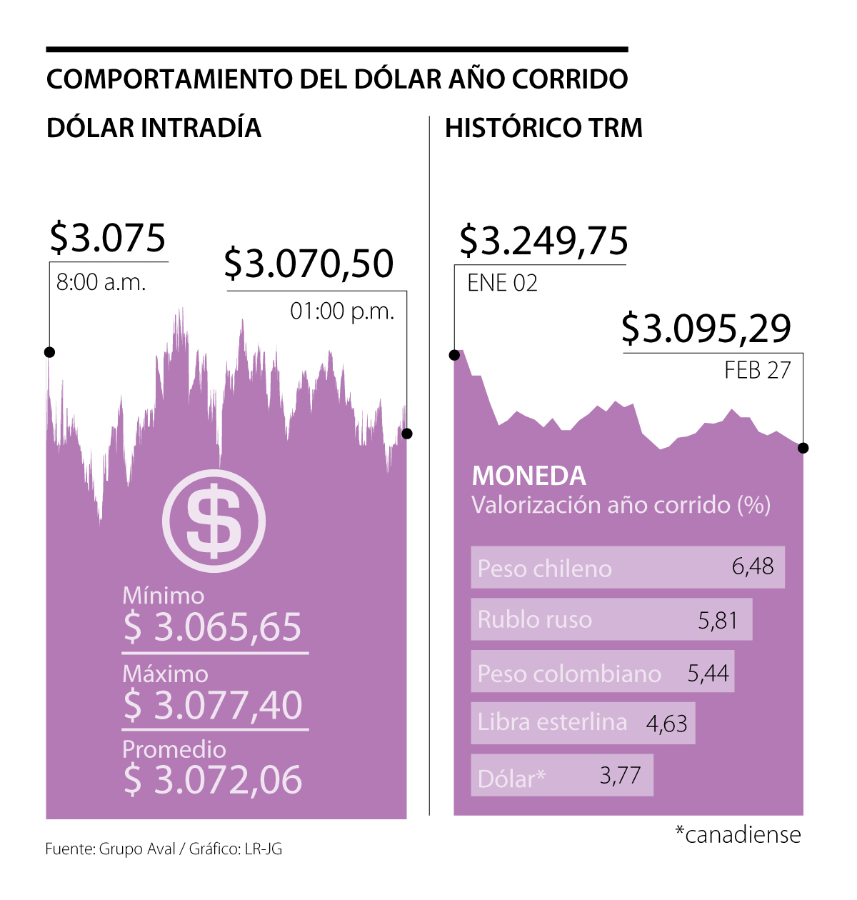 El peso colombiano continúa su fortalecimiento frente al dólar; tanto así, que corridos los dos primeros meses del año, la divisa es la tercera entre las emergentes que muestra una mejor respuesta ante la moneda norteamericana. Esto se traduce en una valorización de 5,44%, que es superada únicamente por el rendimiento del peso chileno (6,48%) y el rublo ruso (5,81%).