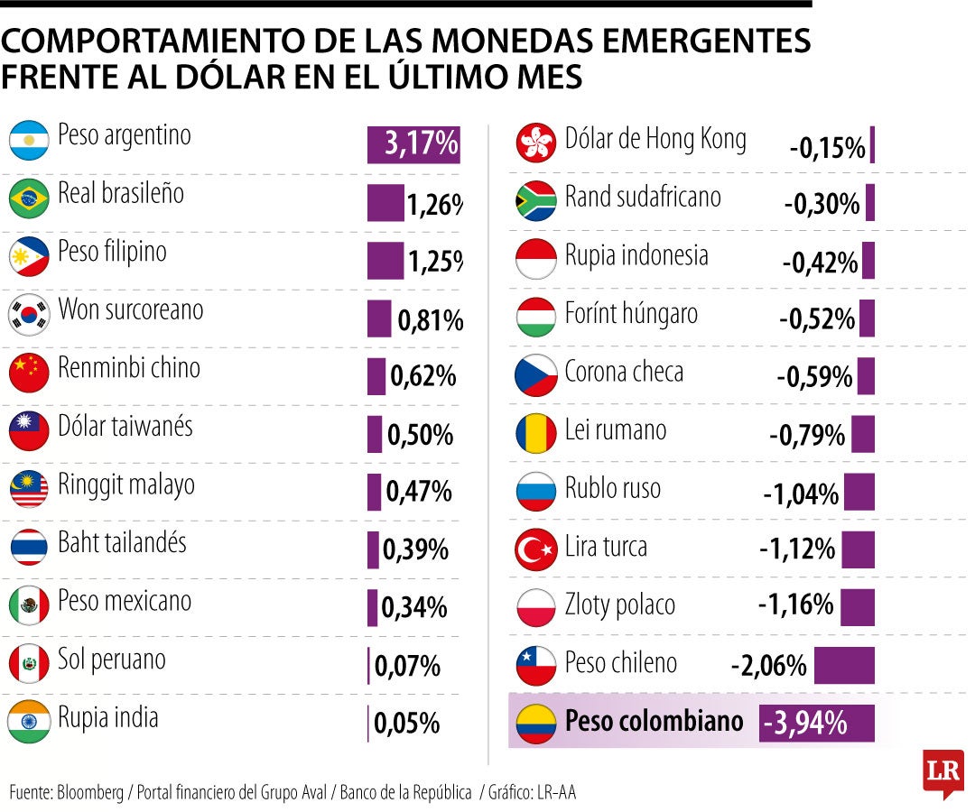 Un ejemplo de ello es que, en el último mes, el peso colombiano ha sido la moneda emergente que más ha perdido terreno frente al billete verde, cayendo 3,98%. Entre las más desvalorizadas le sigue el peso chileno, que tuvo una depreciación de 2,0%; el top tres lo completa el zloty polaco, con una caída en su valor de 1,15%.