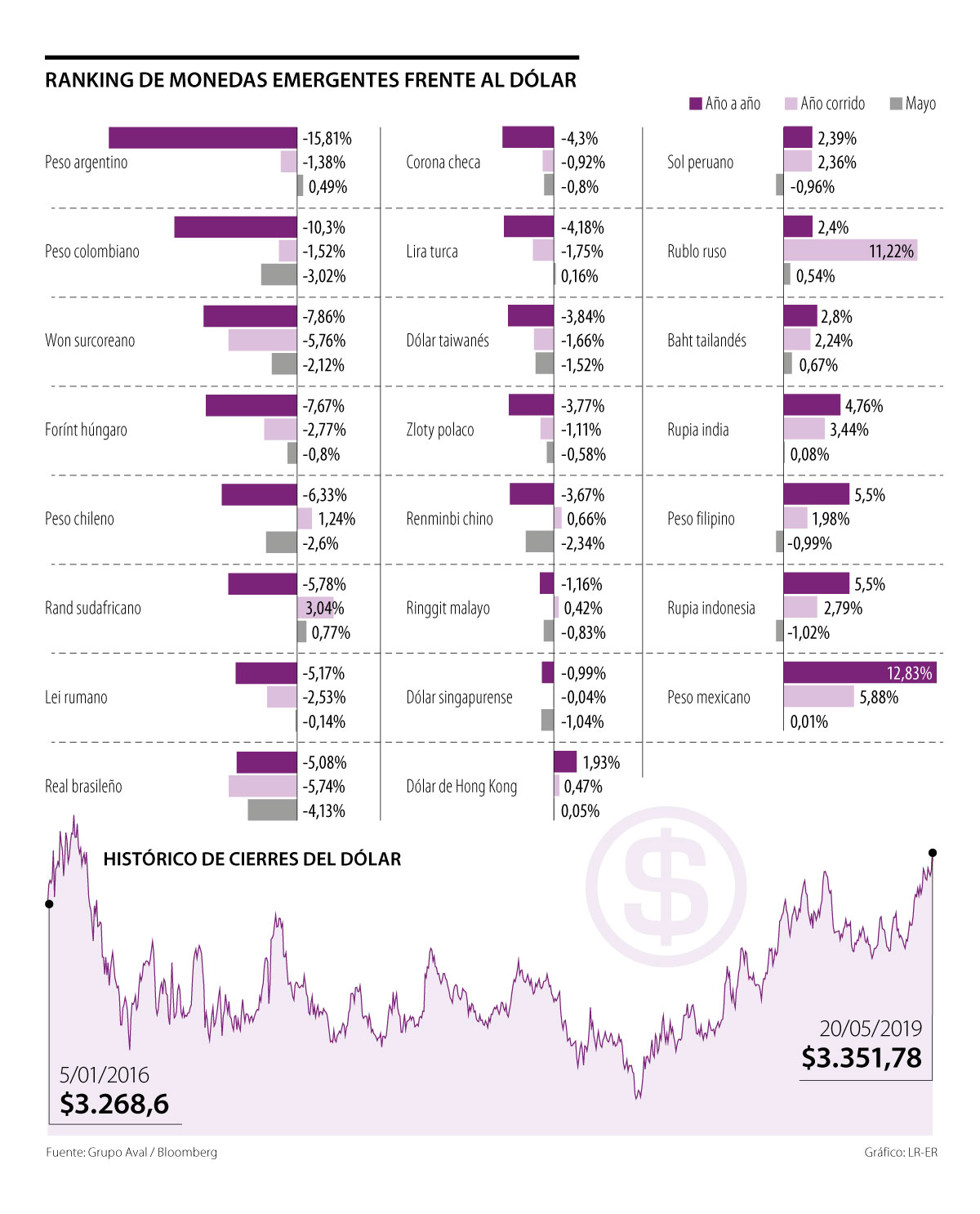El dólar sigue subiendo y ayer pasó de los $3.350. En solo un año, del 21 de mayo de 2018 a 20 de mayo de este año, el peso colombiano se ha devaluado 10,30% frente al dólar. Esto se desprende del ranking de divisas emergentes que crea Bloomberg, en el que de 23 monedas, el peso local es la segunda que más ha cedido respecto a la moneda de EE.UU. Únicamente lo supera el peso argentino, que ha perdido 15,81% de su valor frente a la divisa en el mismo periodo.